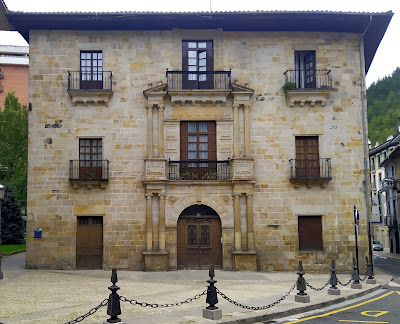 La siguiente parada es en Vergara/Bergara, que a mí sólo me sonaba por el famoso "abrazo" entre Espartero y Maroto, de los que hay representación en uno de los edificios oficiales. Quedan todavía huellas carlistas, aunque parezca increíble. Como hay que fiarse de los lugareños, preguntamos dónde comer y nos encaminan al "Pau Berri". Mientras esperamos, nos traen una ración de pulpo como hacía tiempo que no probábamos y una ensalada de ventresca. El bacalao y las costillas nos dejan casi fuera de juego, pero aún hacemos sitio para un flan de café y otro de queso, más las cerves y los cafés, 45€. Muy recomendable. Después ya podemos patear una ciudad que parece dormida a esta hora, vigilada por enormes edificios de raigambre nobiliaria del XVI y el XVII, con escudos heráldicos, morriones, sillares y balcones de forja. El esplendor llega hasta la época modernista.