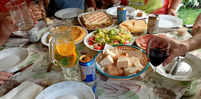 En este entorno, y con la presencia de Mariaje y Lola, que son quienes nos han traído, la puesta en común de anécdotas y vivencias es inagotable, aunque han de volverse a Tudela. Miguel ha preparado una comida que habría que llamar festín. No tiene medida este chico. Tras la siesta aparecen por la casa dos antiguas alumnas del Rural, Salo y Luli. Es una alegría verlas convertidas, una en maestra y la otra en dueña de una floristería. Y lo mejor de todo, con las cabezas muy bien amuebladas. Ellas dicen que por culpa nuestra. Comentan lo que supuso el cambio de la escuela al colegio, con unas metodologías totalmente novedosas. Los recuerdos se amontonan mientras Miguel improvisa lo que los alicantinos llamamos picaeta. Están desbordadas por el reencuentro y el recibimiento que no esperaban.